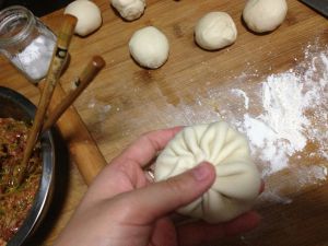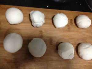 面粉缓缓加入温水,揉成软硬适中的面团。醒发半小时后后揉成光滑的面团。并分成8个小面团。