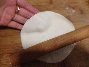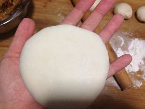 取一个小面团,用手压扁后,用擀饺子皮的方式擀成圆的面片, 不可太薄