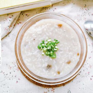 水烧开后,放入大米、姜片(姜是为了去腥),大火烧开,改小火慢熬,汤汁有点粘稠时。
