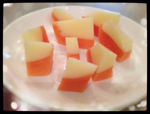 将煮好的牛奶琼脂布丁粉、倒入切开的木瓜中!等冷却后!切开即可装盘食用!