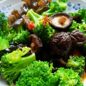 锅里水烧开,放入西蓝花,汆1分钟取出入冷水,木耳汆1分钟入冷水,香菇汆1.5分钟捞出。沥干。