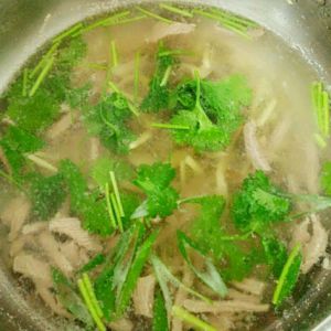 等水锅开了,下入肉丝,加入榨菜,放入适量盐。