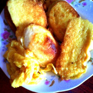 油下锅,趁油热的空当我们将馒头沾匀蛋液,(两面都要)