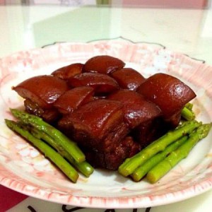 五花肉切块洗净,加入葱姜放入冷水煮沸。将肉以热水洗净擦干