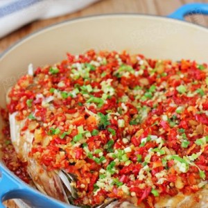 将剁椒铺在鱼头上面,然后将味淋淋在鱼头上。