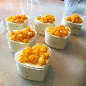 将芒果奶油浆装入容器,上面铺上芒果丁,放入冰箱冷冻。美味可口的芒果冰淇淋做好了。