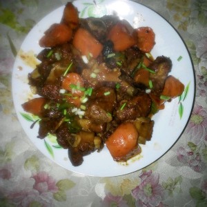 加冷水至水稍稍没过排骨。加盐适量,白糖适量,水烧开后改用小火闷煮20分钟左右,待汤汁快干时再加开水至水刚好与排骨齐平,将胡萝卜丁,辣椒丁盖在排骨上,继续闷15分钟左右,改大火收汁。