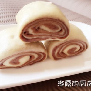 分别擀成片。我擀的有点太薄了,把可可的这片放在上面。卷起来就可以了。