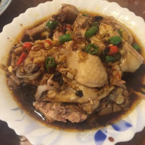 将剁好的鸡块码放进盘内浇上调好的汁就可以了,可以的话加些花生碎和香菜更好,家里正好没有就作罢了,可以啦,上菜!