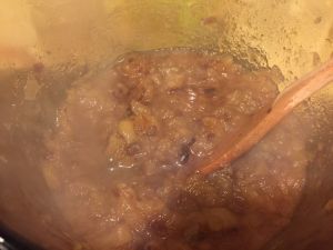 这时候苹果已经完全软烂,打开盖,用木勺不断搅拌、碾压,慢慢收汁达到粘稠。依照个人喜好,可以保留一些块状苹果,但是一定要达到一碰即碎的状态。