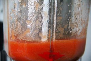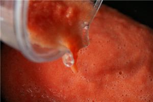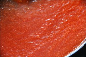 将打好的番茄泥倒入平底锅中,小火慢慢加热,将番茄泥煮开