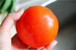 准备番茄,用流水冲洗干净,去蒂,在番茄底部用刀开划一个十字