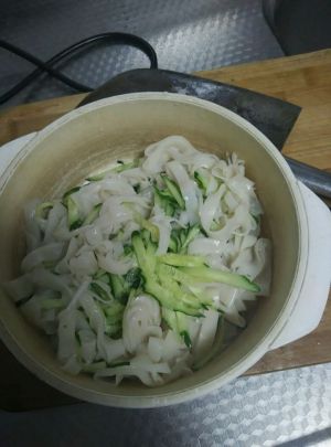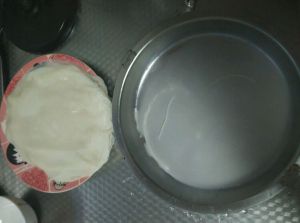 现在我们开始蒸凉皮,舀上薄薄的一层凉皮面,锅里烧开水