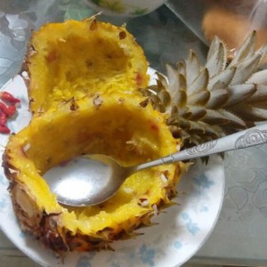 火腿丁,葡萄干跟放凉的米饭,菠萝肉混合好填进菠萝碗里,满一点盖上盖子,用牙签固定,上锅蒸,十分钟