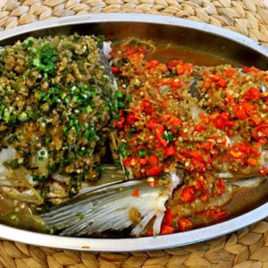剁椒做好后,两种颜色的剁椒,分别均匀的抹在两个鱼头上。