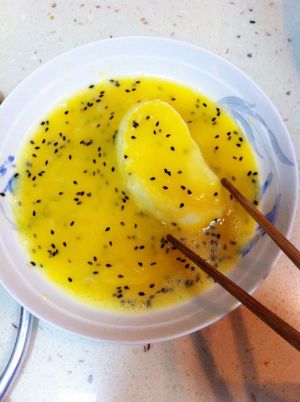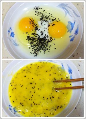 鸡蛋打入盘子中,加盐、黑芝麻、少许白糖搅打均匀。