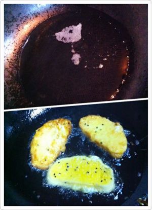 炒锅烧热,倒入一些食用油烧至5成热,放入沾满蛋液的馒头片,煎至两面金黄即可。