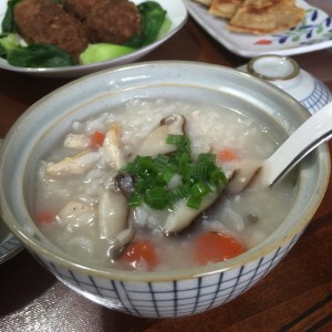 加鸡肉,略煮一阵子(鸡肉很好熟),米开了,浓稠了就好了~最后加上小葱碎~