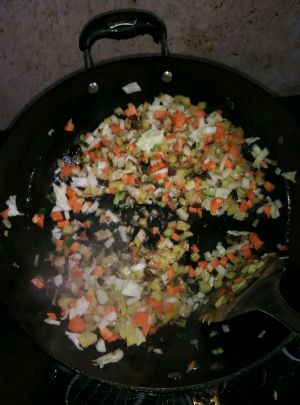 把切好的食材按熟的时间先后加入锅中翻炒。