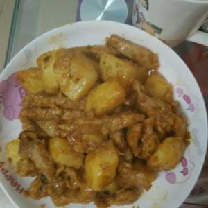 5锅里的油倒出,不用留油,沾在锅边的油够了,里脊肉倒进去翻炒,加入2勺料酒,糖,白醋,生粉勾芡,让汁更浓点,汁收的差不多了就可以倒土豆进去了