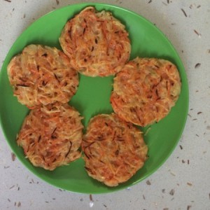 土豆 胡萝卜洗净削皮 擦丝 葱切末 混合一起 加适量面粉 鸡精 盐 搅拌 粘在一起就行 面粉不要太多