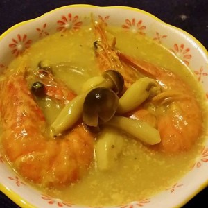 捞出上步的料,下蘑菇,虾,柠檬切片,最好是挤汁加入,我犯懒了,柠檬籽切记去除,特别苦。