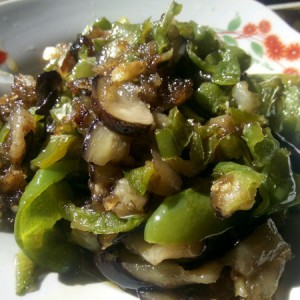 锅里油烧热以后,把准备好的葱姜,放进去炒,再然后把拌好的茄子辣椒放进去炒,等到锅里没有油时,记得加油炒,要多加一点油炒,但油也不要放太多,太多了的话会很油。记住,锅里的油烧干时不可以加水。