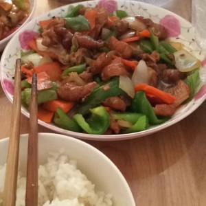 依次加入肥肠,洋葱,胡萝卜,尖椒,同时放料酒、醋、酱油,白糖,盐、一小勺蚝油