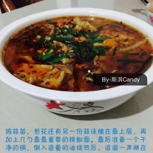 最后就把切成段的蒜苗,葱花,另一份大蒜朝天椒沫还有最最重要的干辣椒面依次铺在最顶层。准备一个干净的锅,倒入适量的油烧热后淋在碗里,滋溜滋溜的声音伴随着香味扑面而来,然后就大功告成了。