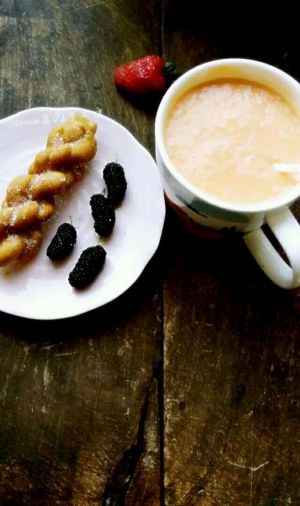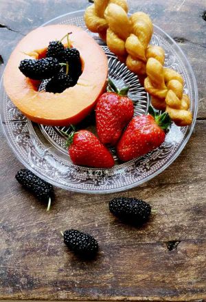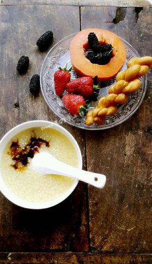 小米粥,麻花,水果,桑葚,木瓜营养的早餐!