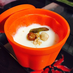 再把它们慢慢倒回有奶皮的容器里。奶皮会浮上来