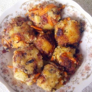 用勺子将土豆泥压成小饼状,再放入锅中煎,两面都变成金黄色即可。