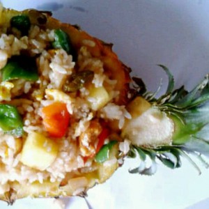 开始制作:锅里放油,油热好放入准备好的鸡蛋爆炒成碎片。捞出鸡蛋,锅里放入洋葱爆炒1分钟出味,加入青红椒、虾仁粒,爆炒3分钟后加入米饭继续炒2分钟。最后加入鸡蛋、腰果、葡萄干、少许盐、蚝油、鸡精出锅盛入菠萝盒子。(图片不全只能用语言描述了,请谅解。但确实亲手经过多次修改配方后所做,口感及效果不同凡响)