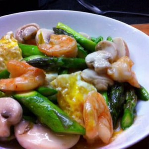 水淀粉加盐备用,洗净炒锅重新座少许油,炒香姜丝,下蘑菇炒软,放入芦笋、蛋脯和虾仁,倒入水淀粉勾薄芡装盘。