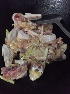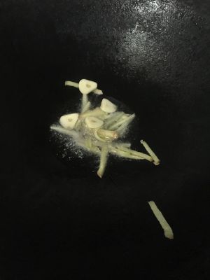 把锅烧热,下生姜丝,一瓣大蒜头煸出香味