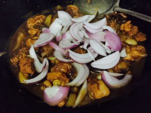 加入洋葱再煮几分钟,加少量盐,大火收汁。