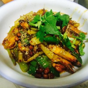 把油烧热,将泡好的虾进锅煎炸,土豆条煎炸,花生煎炸,一一盛出。把准备好的葱段、姜蒜、干辣椒、花椒、豆瓣、火锅底料放进锅内扁炒。将所有食材倒进锅内翻炒。3分钟后盛出,撒上芝麻、芹菜叶。