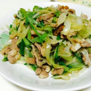 大葱切丝备用,肥的羊油被爆出以后马上倒入瘦的羊肉,翻炒至变色后,马上倒入葱丝