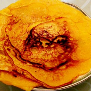 南瓜泥调好后,把平底锅烧红后关到中小火,放少许油,用汤勺把泥放到锅中间,再抹平,抹薄一点,两面煎到金黄,这样好吃简单的南瓜饼做成了。