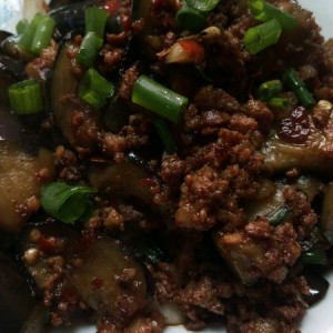油锅烧热,肉末煸炒变色后,放入老抽炒匀,再加一勺豆瓣酱,炒出红油后,放入葱蒜,茄子,翻炒。放入少许盐,鸡精,拌匀即可。