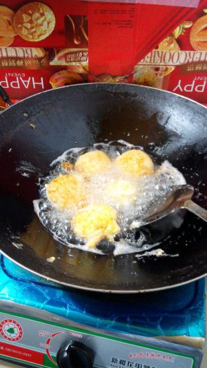 糯米蒸熟后捏成团,裹上鸡蛋液(当然糯米团里面还是可以放很多自己喜欢吃的馅料喔)