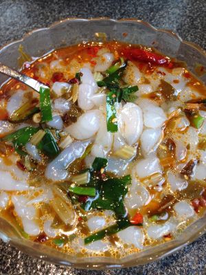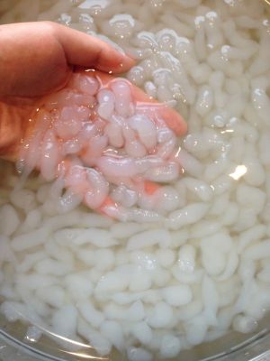 漏好的粉芡见凉开水立刻就成型了,这就是鱼鱼。
