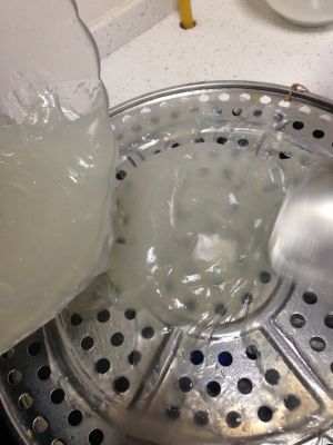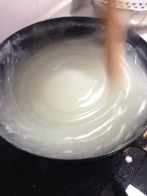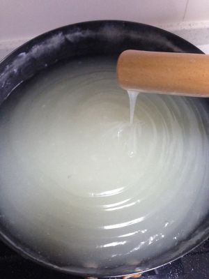 将绿豆粉用一比四的水混合,倒入锅中加热,不停同一方向搅拌。