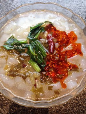 盛一大勺鱼鱼沥水入碗,加一大勺浆水菜,加一撮韭菜,加一点儿油泼辣子,