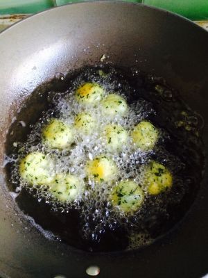 制成圆球,炸制微黄色,捞出,在复炸一次!