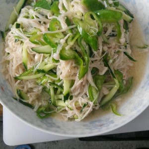 第二步黄瓜,青椒切丝待用。