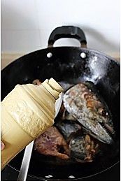 加入半锅开水炖鱼,大火烧开转小火,将鱼籽什么的都放进去