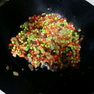 先倒入少许油然后倒入腊肉香肠再倒入豌豆和胡萝卜因为这两个会炒的时间比较久然后再加入米饭因为土豆和莴笋会比较熟的快,所以把米饭炒散后再加入土豆和莴笋。也可根据食物熟的程度快慢加入食物哟