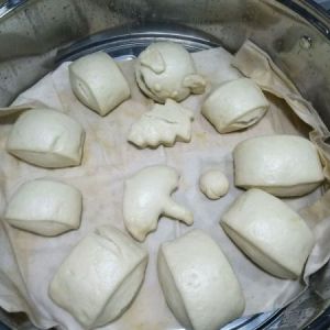 拿出来在案板上撒层薄面,开始揉,不断排气,大约三五分钟。然后揉成条,切剂子,再放置醒发20分,开始上锅蒸。