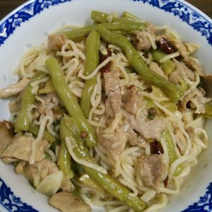 加入扁豆,适量盐,鸡精,生抽炒匀,下蒜片儿